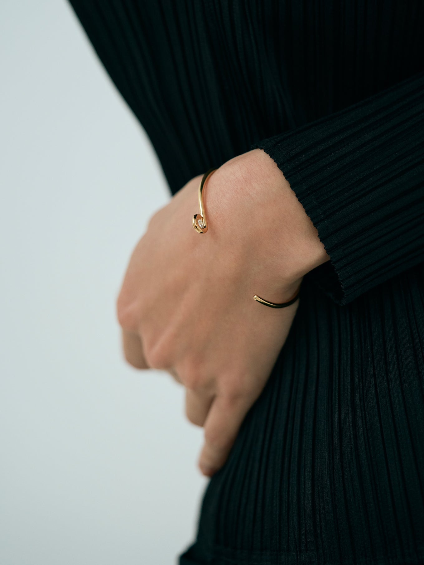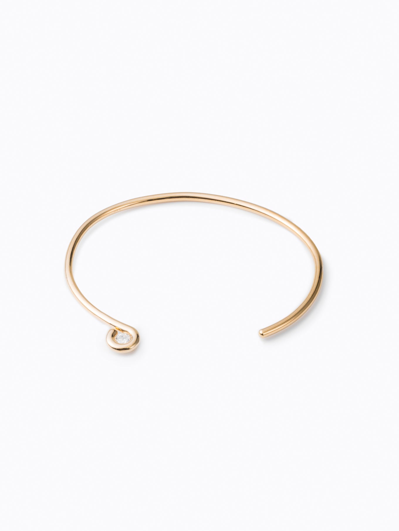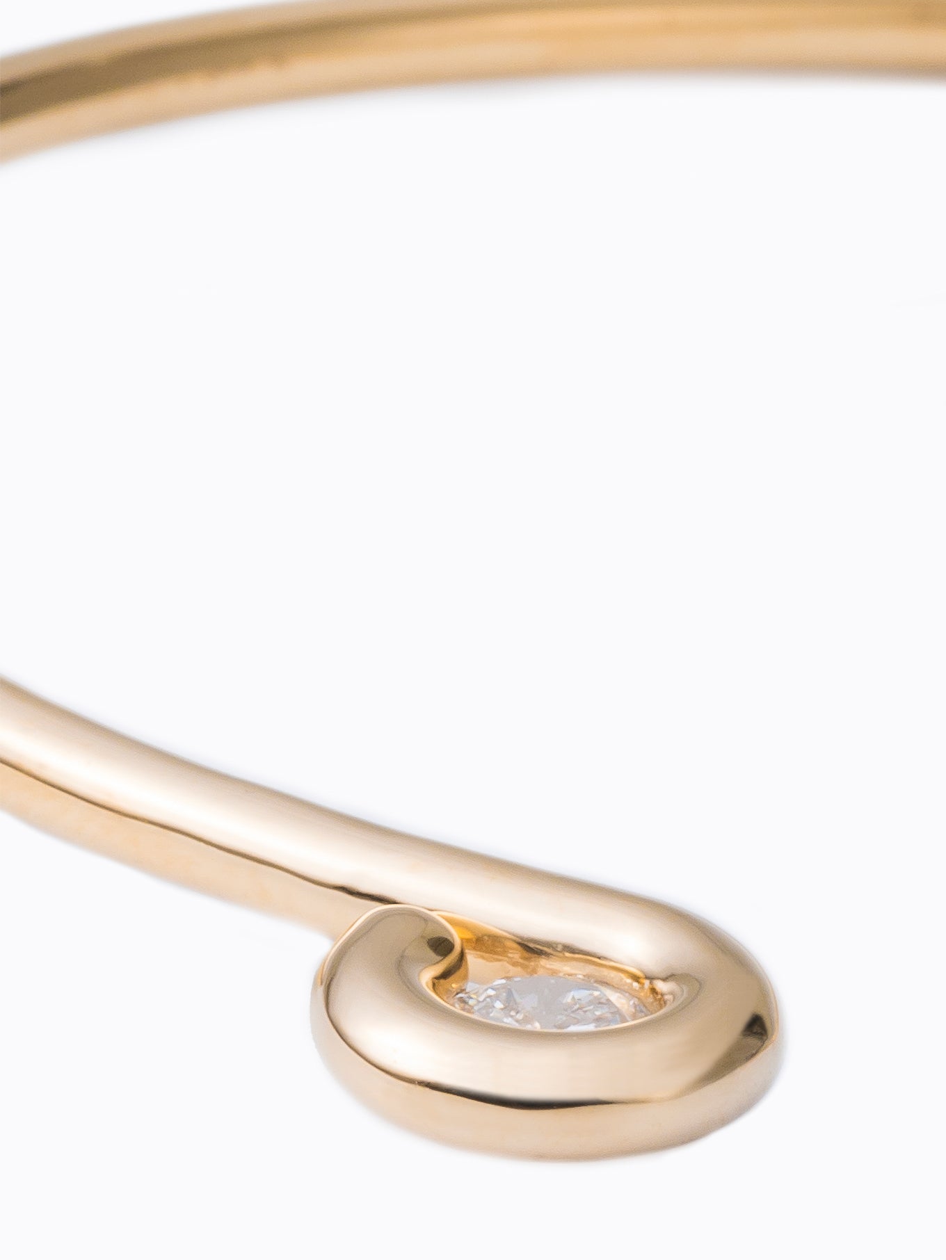 王道のラウンドブリリアントカットのダイヤモンドを1本の線で包むようにミニマルに構成したバングル。キューレット部分を露出したデザインは、シンプルでありながらさりげないエッジを演出します。