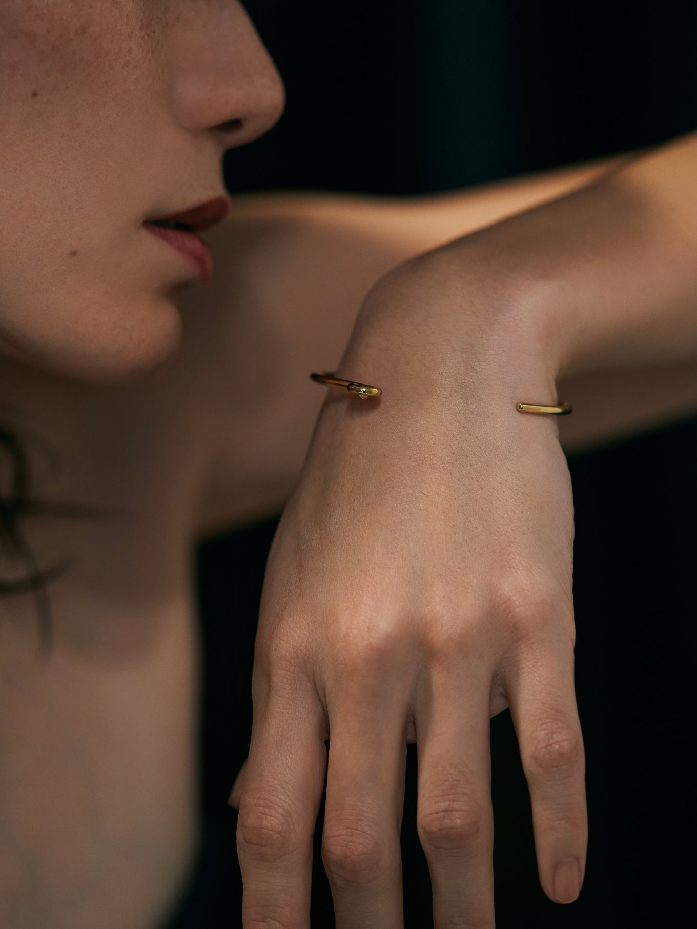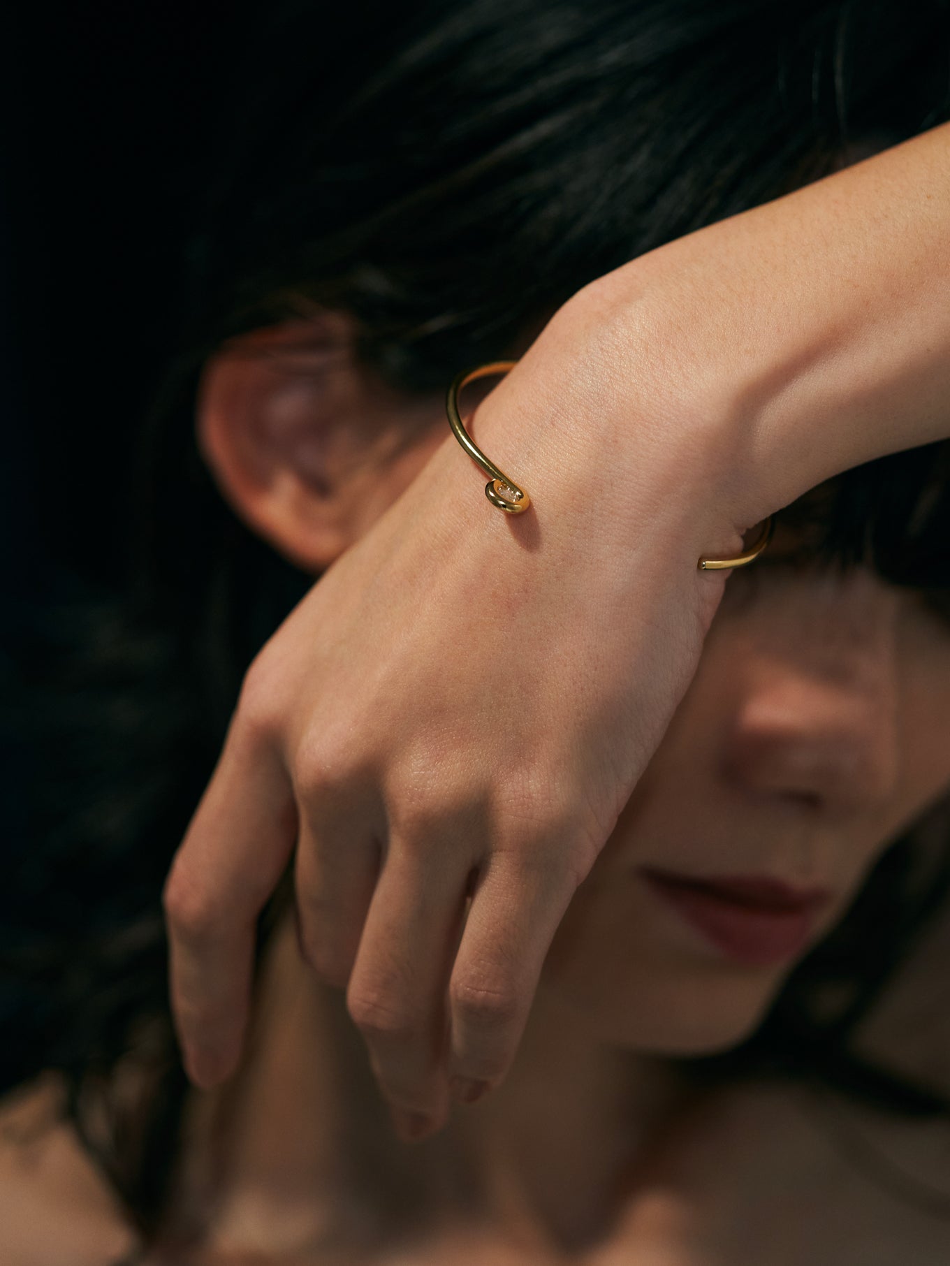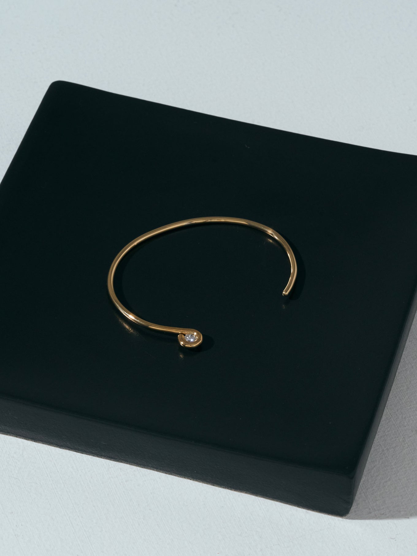 王道のラウンドブリリアントカットのダイヤモンドを1本の線で包むようにミニマルに構成したバングル。キューレット部分を露出したデザインは、シンプルでありながらさりげないエッジを演出します。