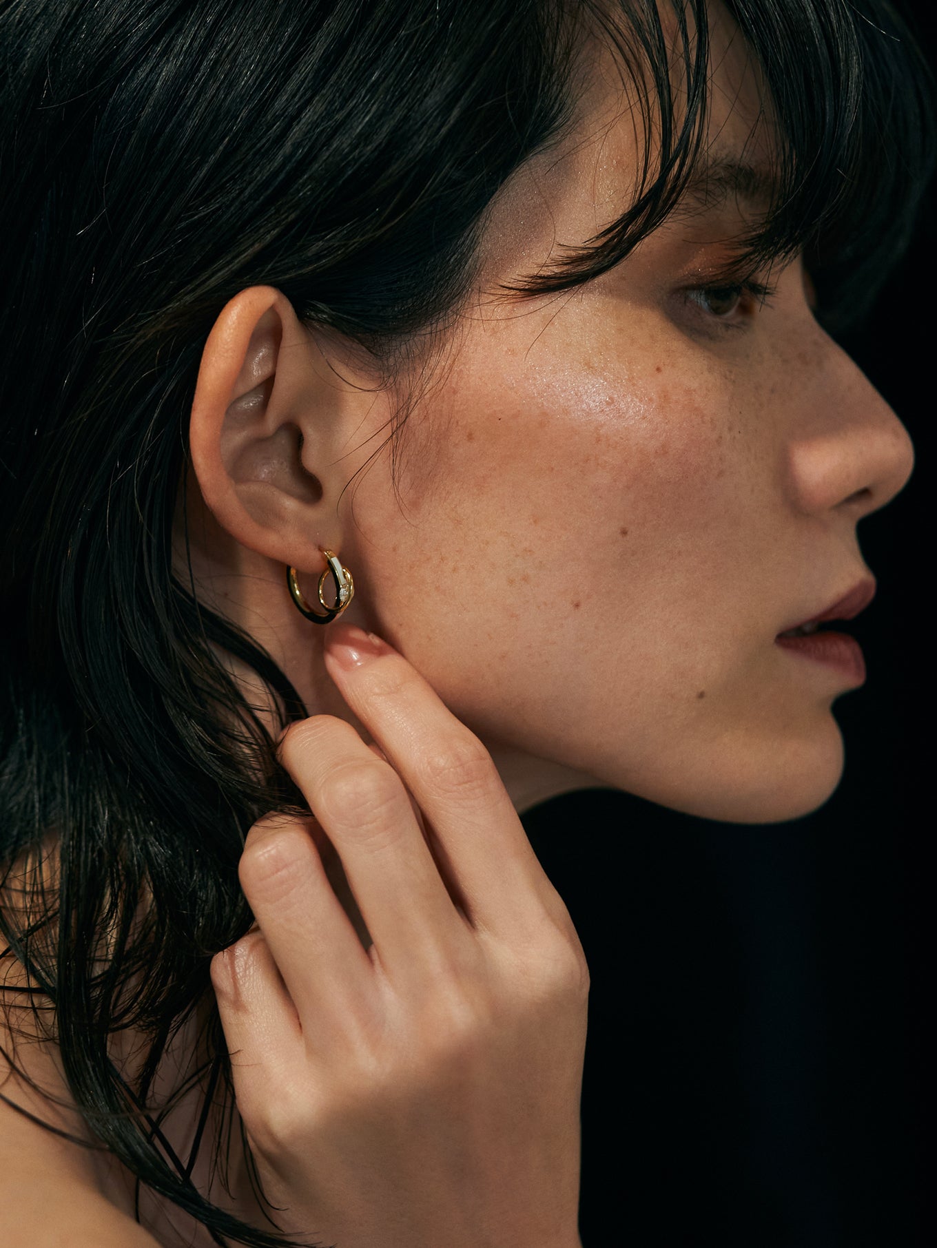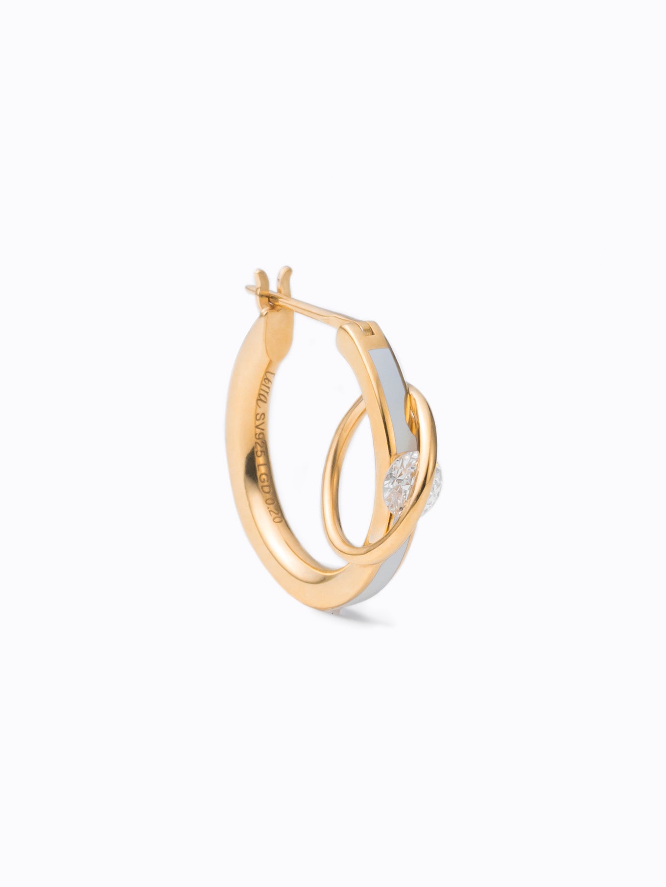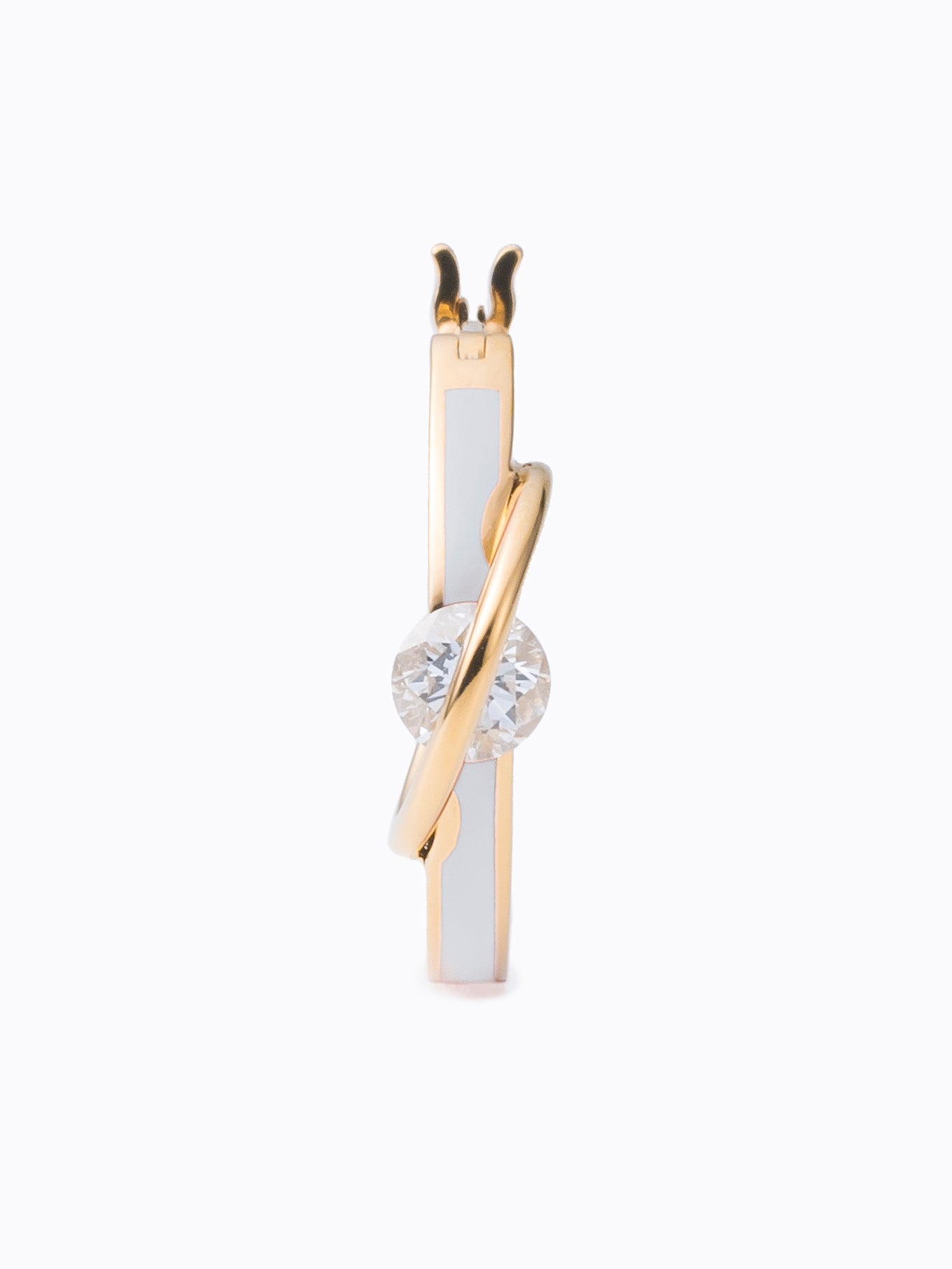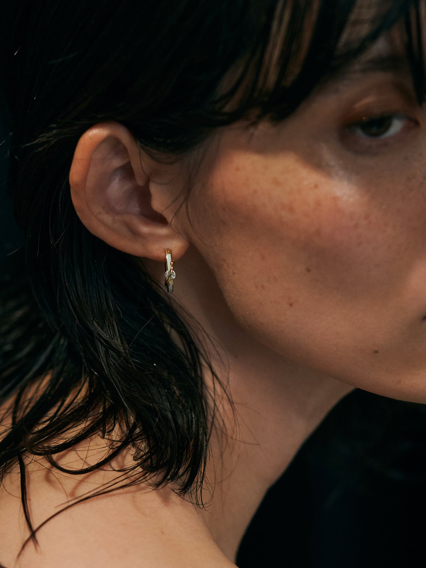 2つの輪の間にダイヤモンドを挟むようにセッティングしたフープピアス。ダイヤモンドの表面を地金が横断するデザインは石の側面を露わにし、新たな表情を生み出します。”CLOUD”カラーは、職人が1点ずつ着色。左右の組み合わせを自由にお楽しみいただけるシングルピアスです。