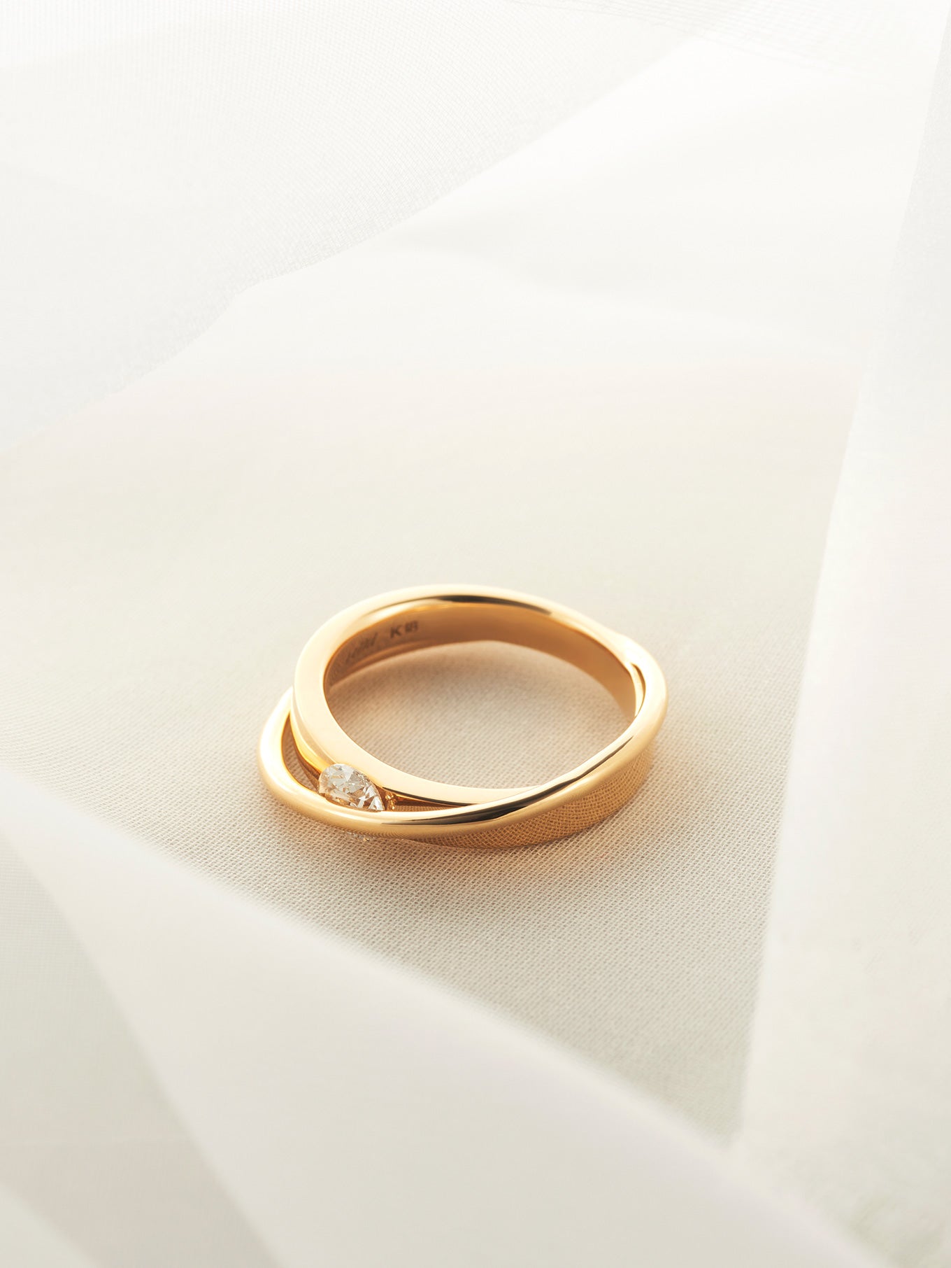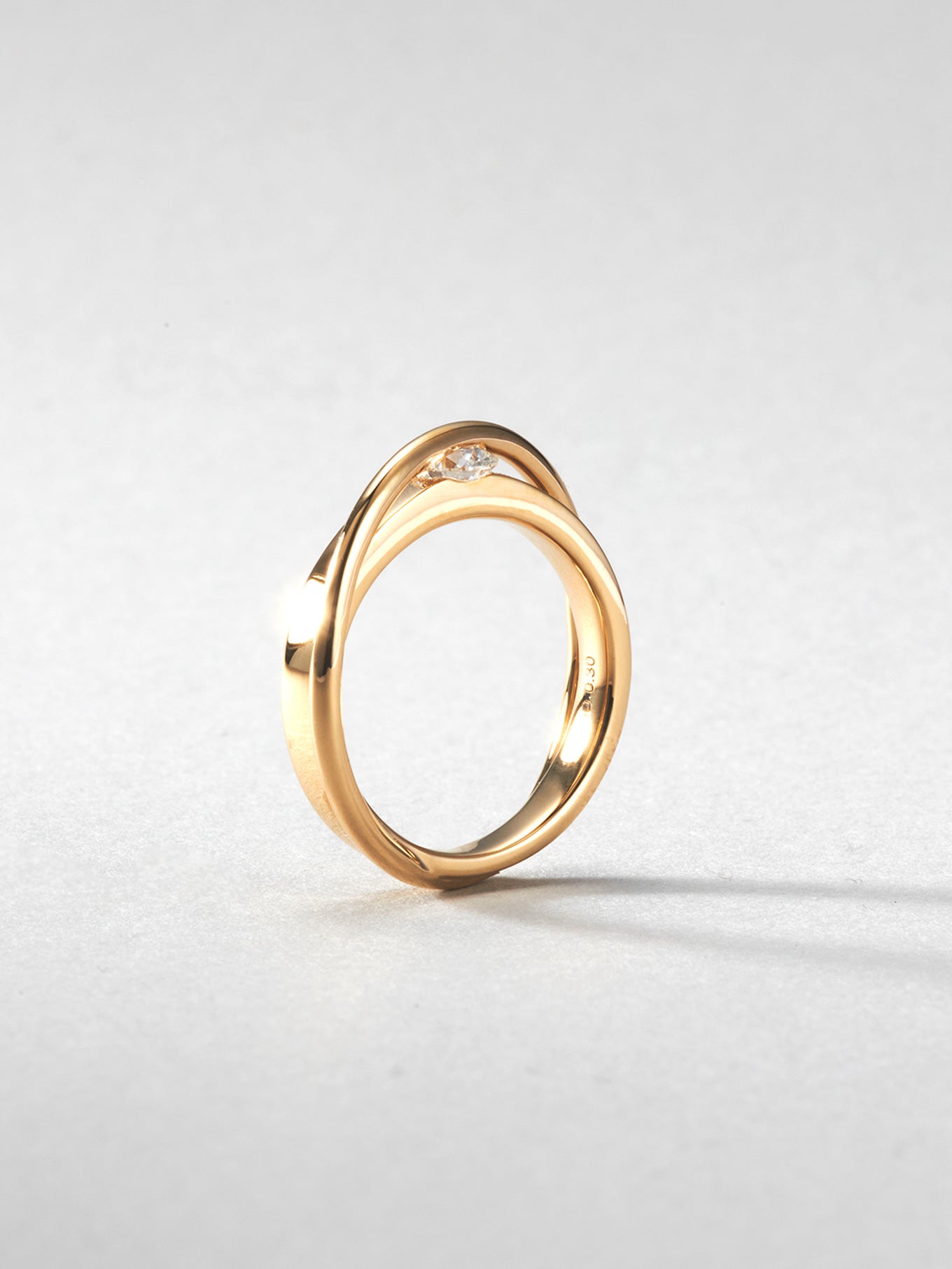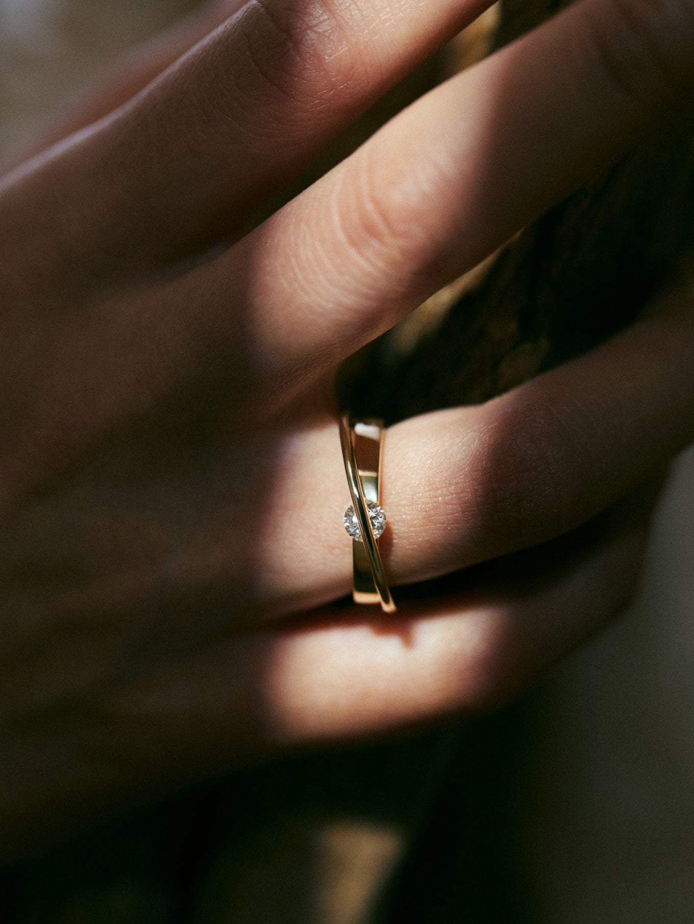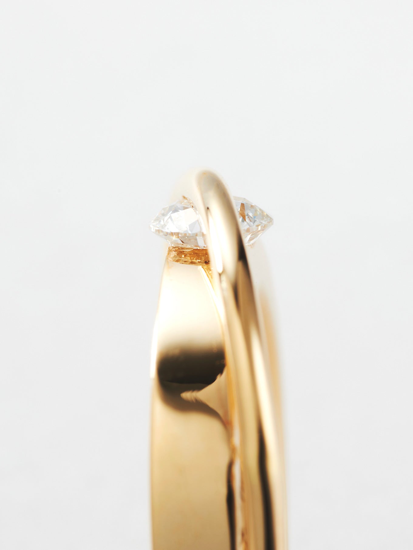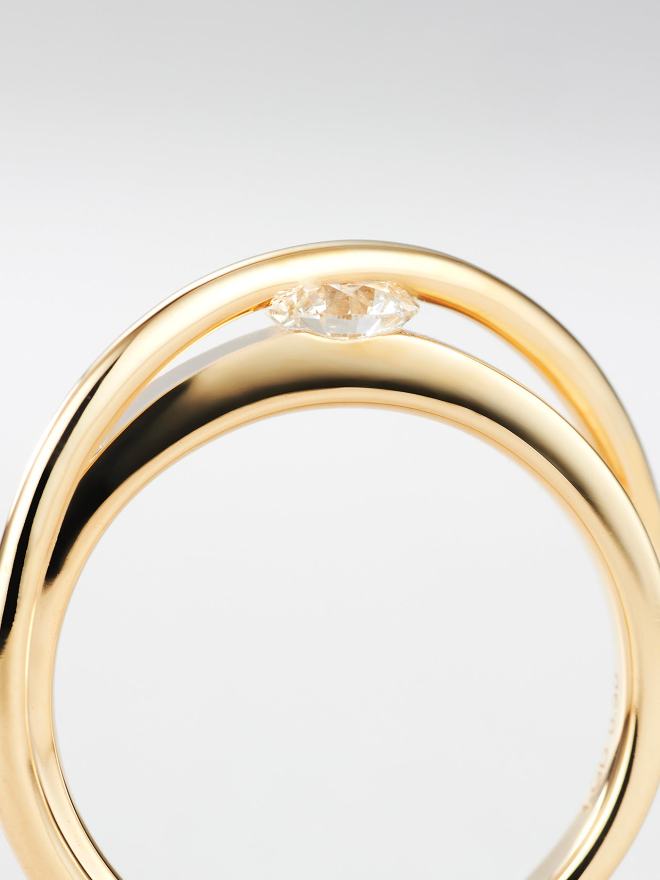 2本の地金でダイヤモンドを挟んだセッティング。ダイヤモンドの表面を地金が横断するデザインは石の側面を露わにし、新たな表情を生み出します。EGR1は、金属とダイヤモンドが生み出す伝統的なデザイン形式からの脱却と大胆な表現をテーマとした「Engage」コレクションの一作です。