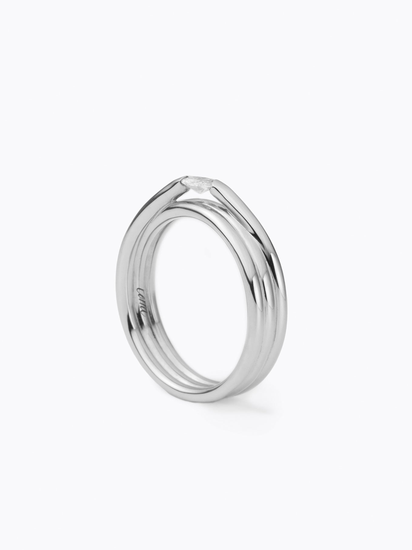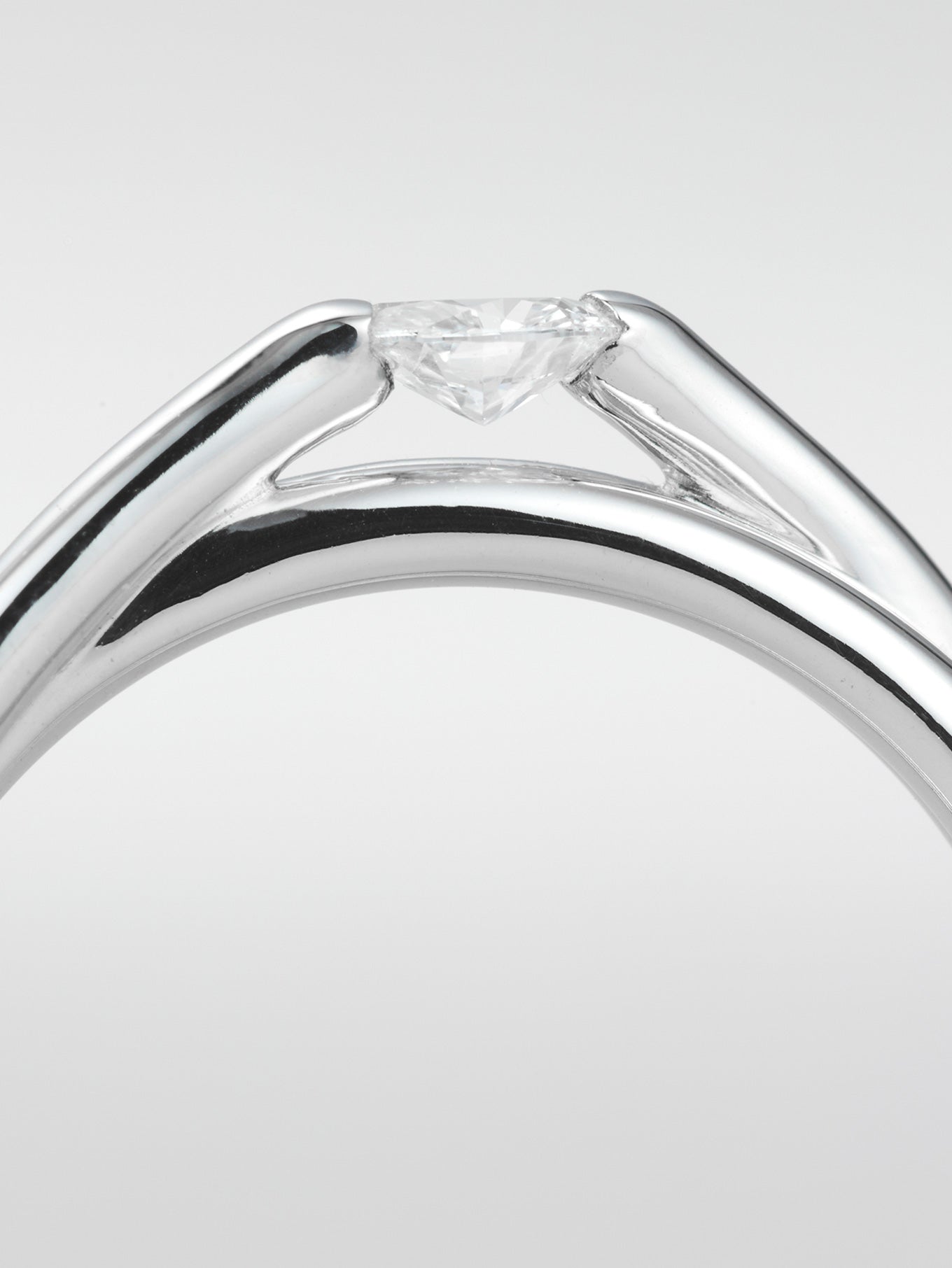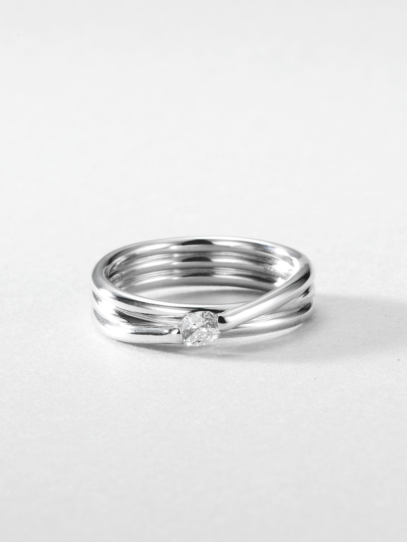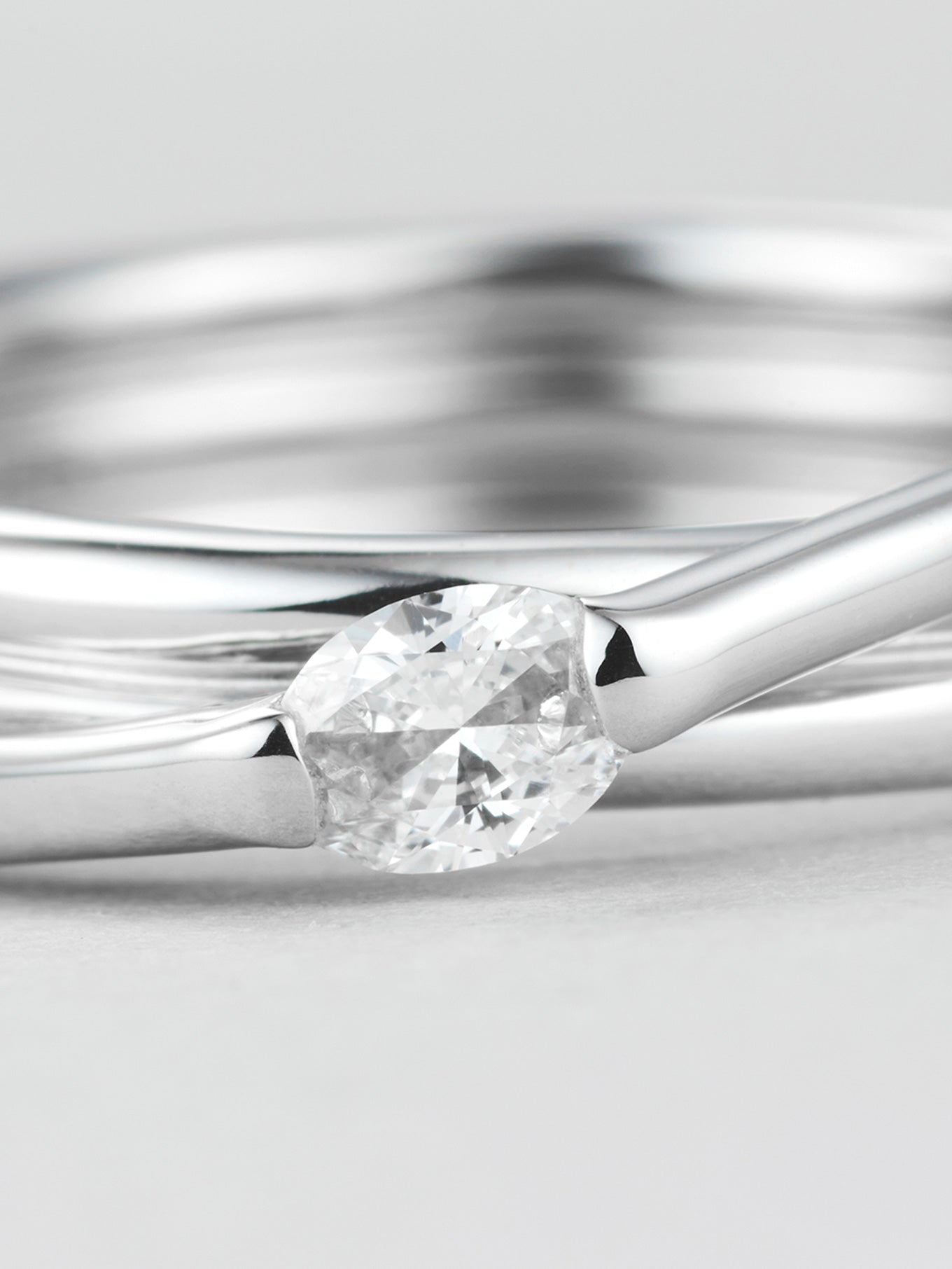 オーバルカットのダイヤモンドを両サイドの地金で摘んだセッティング。石を浮かせキューレット部分を露わにしたデザインは、あらゆる角度から光を取り入れダイヤモンドを大胆に輝かせます。EGR3は、金属とダイヤモンドが生み出す伝統的なデザイン形式からの脱却と大胆な表現をテーマとした「Engage」コレクションの一作です。