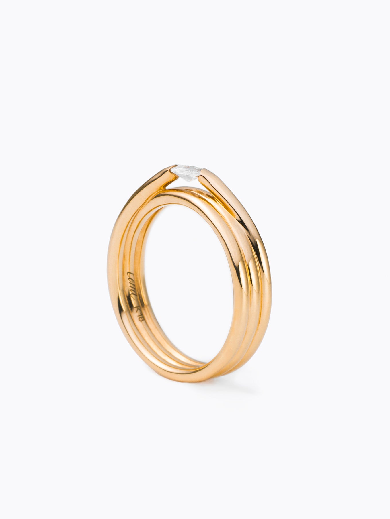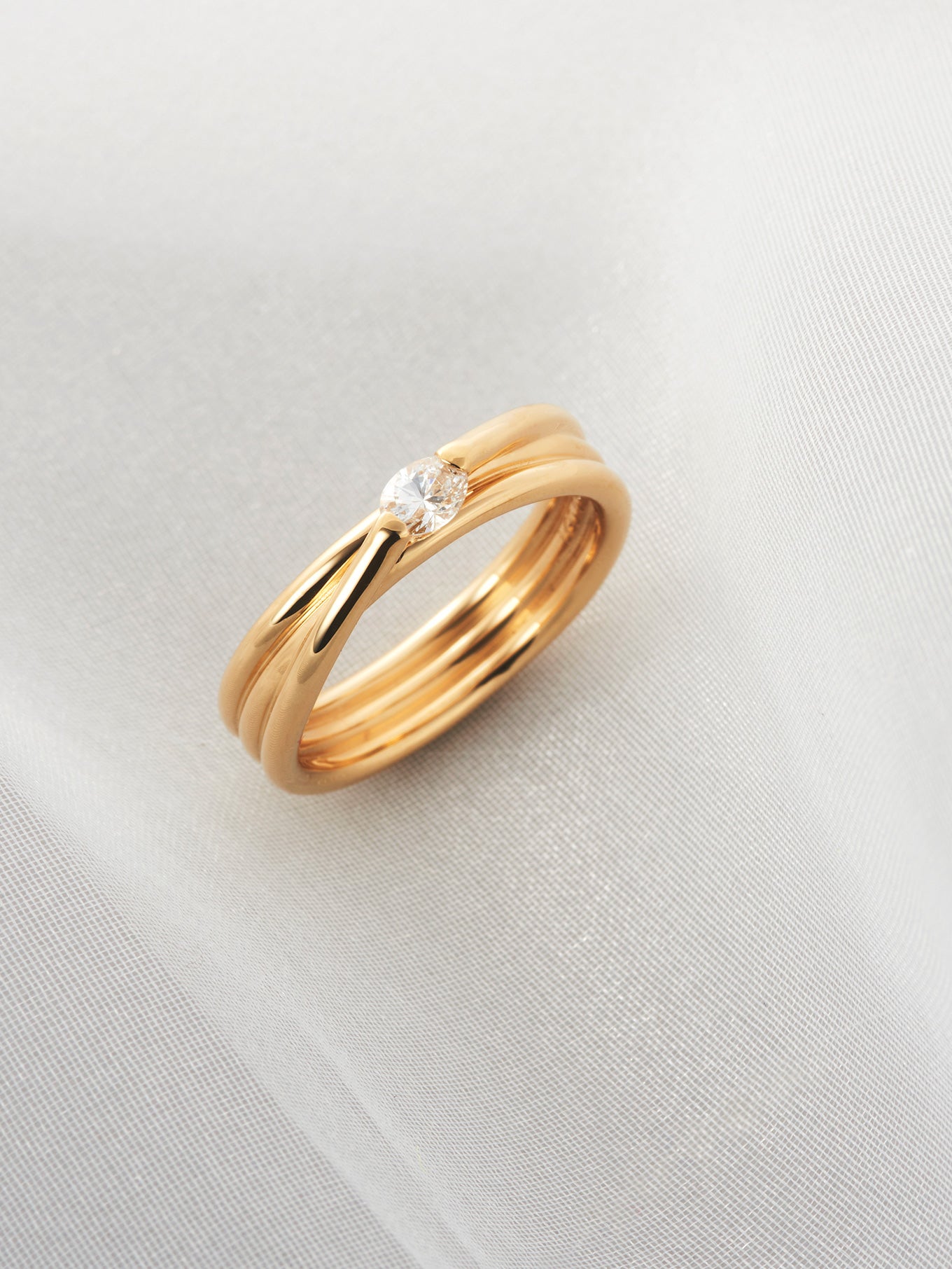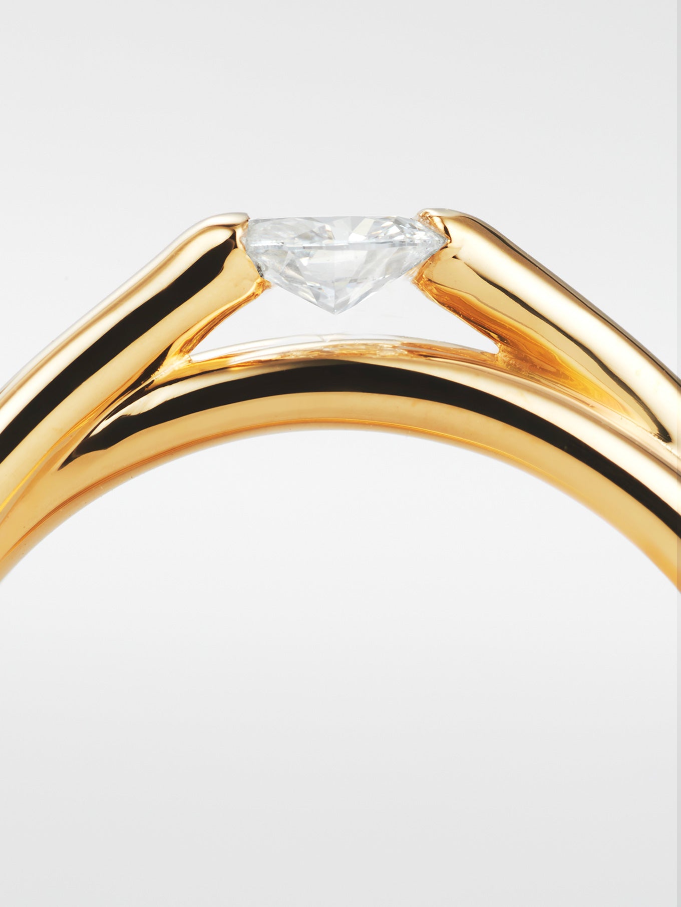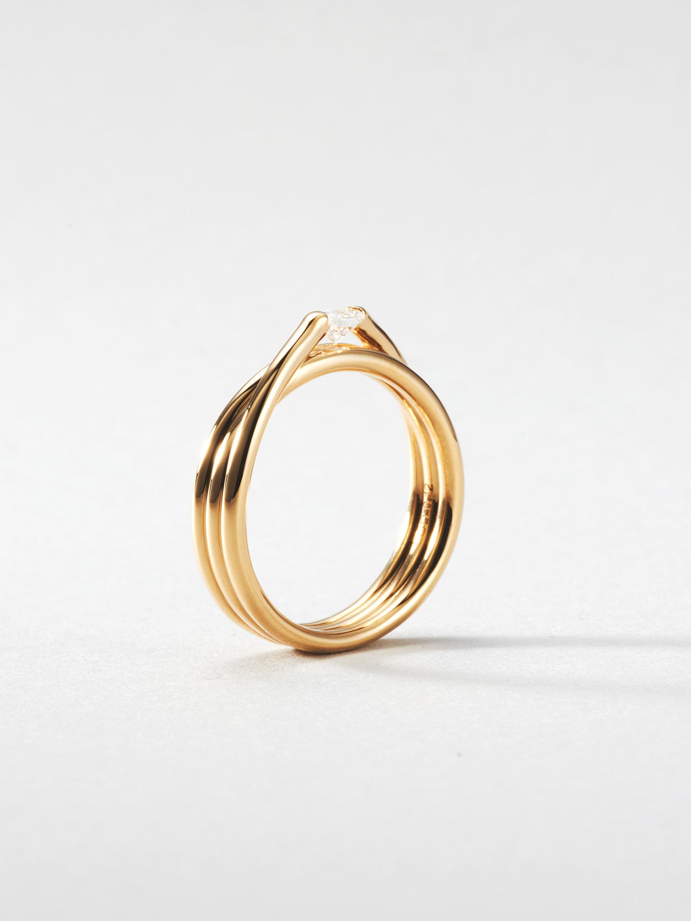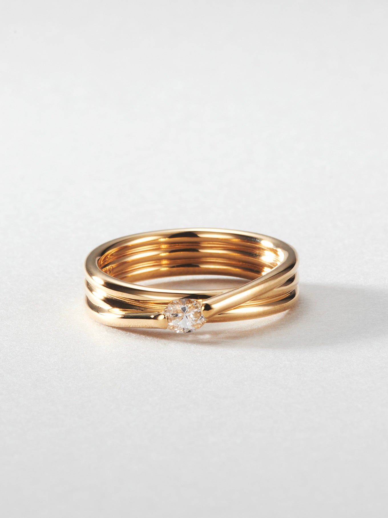 オーバルカットのダイヤモンドを左右の地金で摘んだセッティング。石を浮かせキューレット部分を露わにしたデザインは、あらゆる角度から光を取り入れダイヤモンドを大胆に輝かせます。EGR3は、金属とダイヤモンドが生み出す伝統的なデザイン形式からの脱却と大胆な表現をテーマとした「Engage」コレクションの一作です。