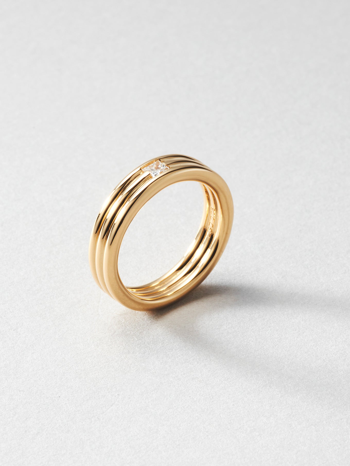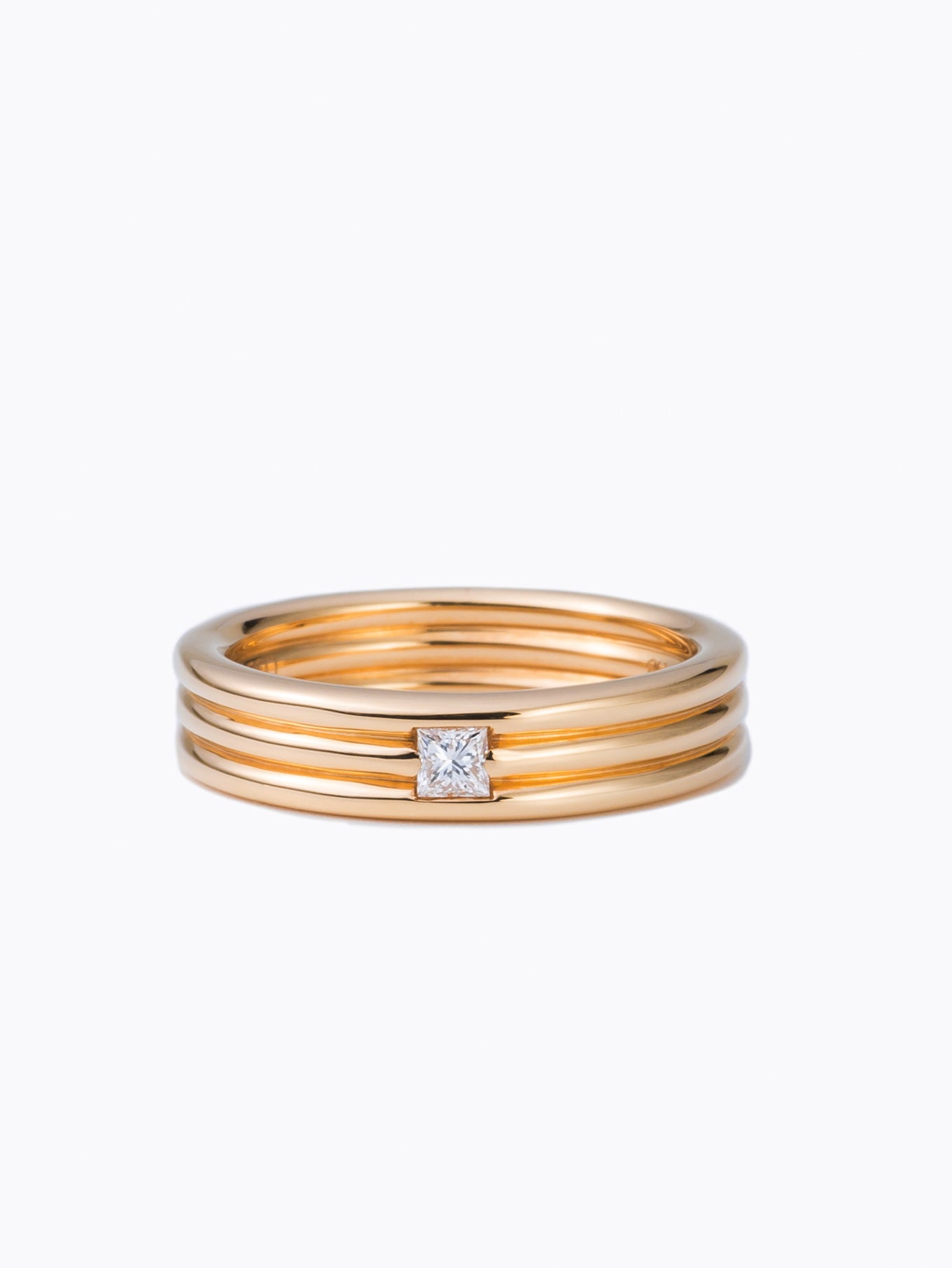 コイル状に巻かれた3本の線がプリンセスカットのダイヤモンドを挟み込むようにセッティング。EGR4は、金属とダイヤモンドが生み出す伝統的なデザイン形式からの脱却と大胆な表現をテーマとした「Engage」コレクションの一作です。