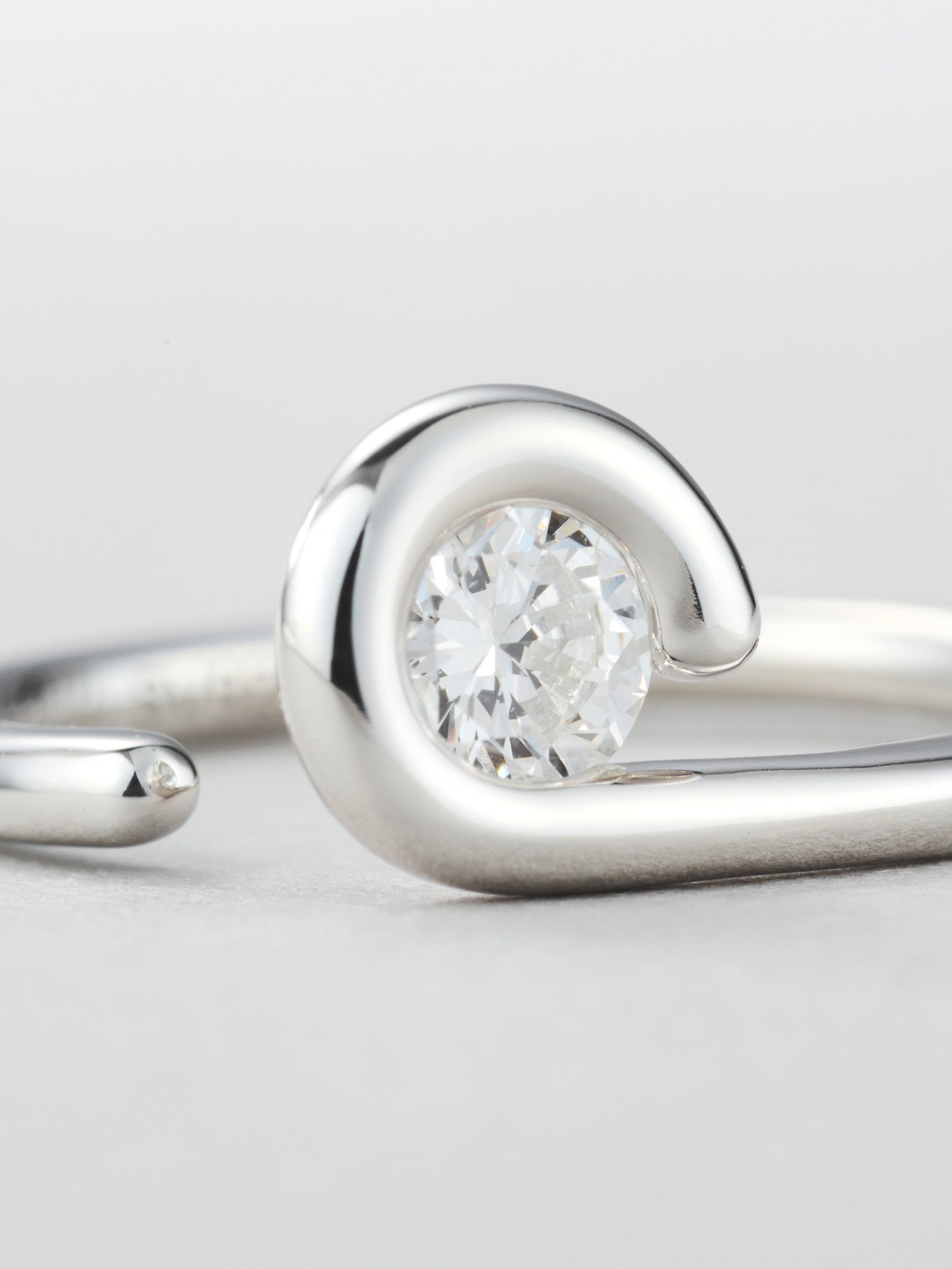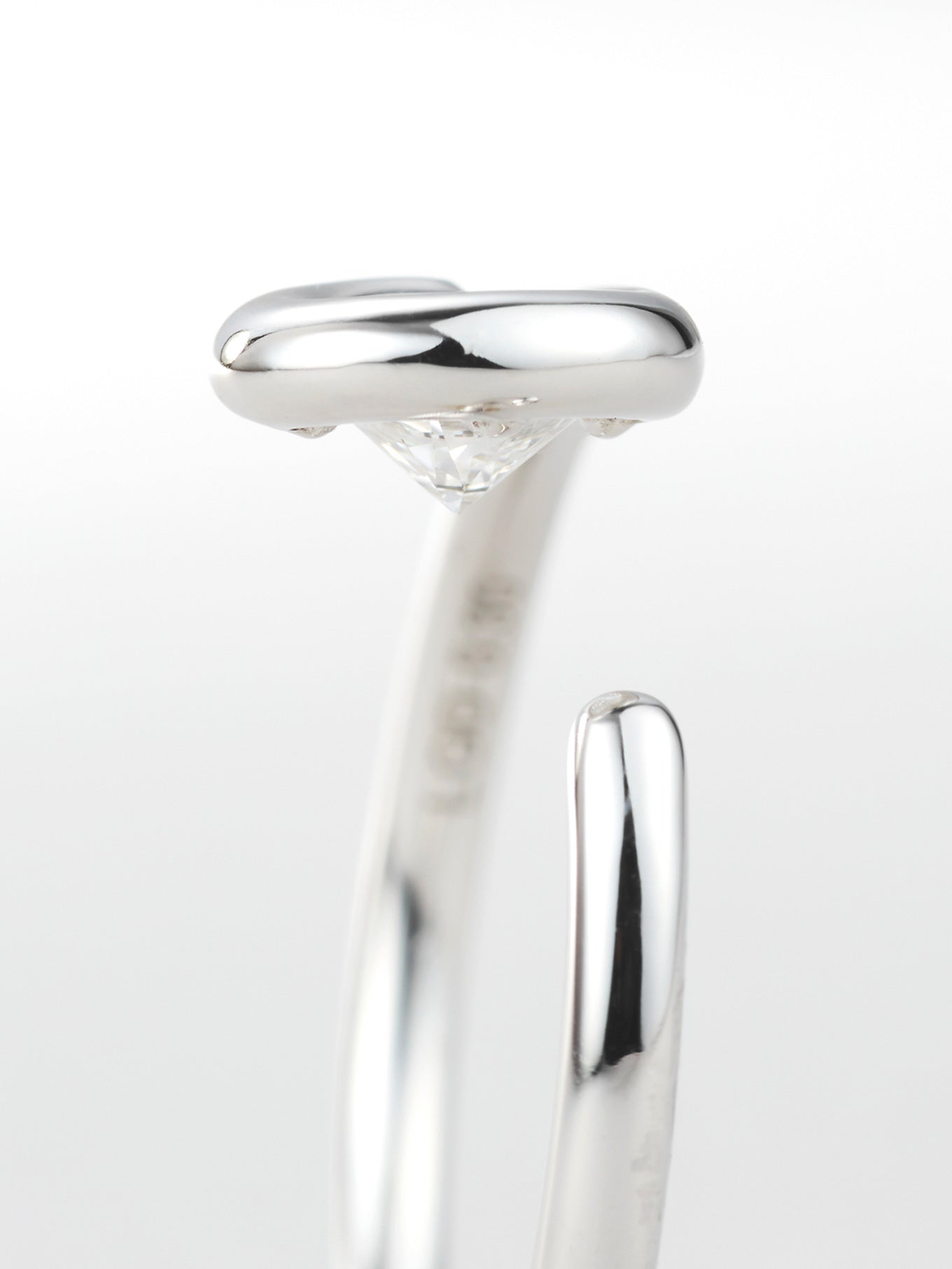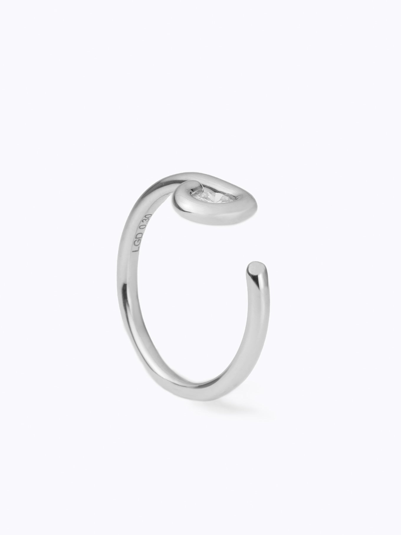 王道のラウンドブリリアントカットのダイヤモンドを1本の線で巻いたデザイン。ダイヤモンドのキューレット部分を大胆に露出し、ミニマルなデザインでありながらエッジィな表情に仕上げています。EGR5は、金属とダイヤモンドが生み出す伝統的なデザイン形式からの脱却と大胆な表現をテーマとした「Engage」コレクションの一作です。