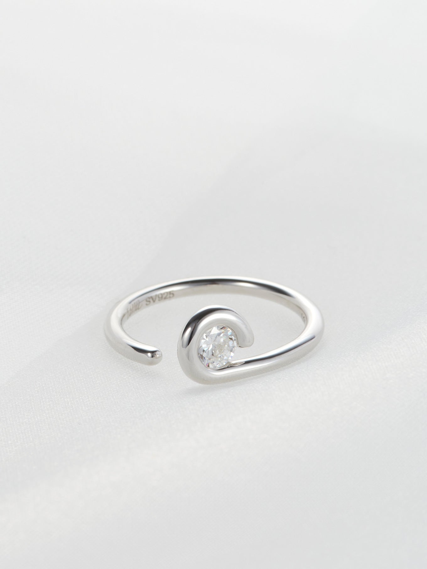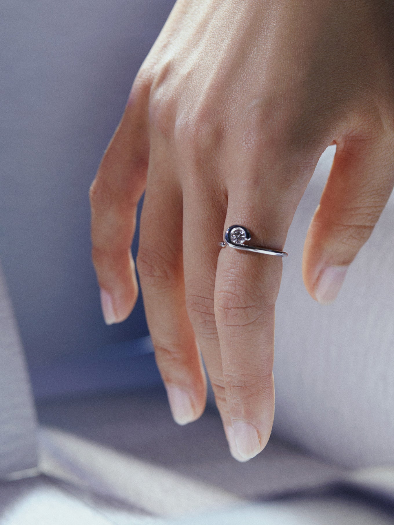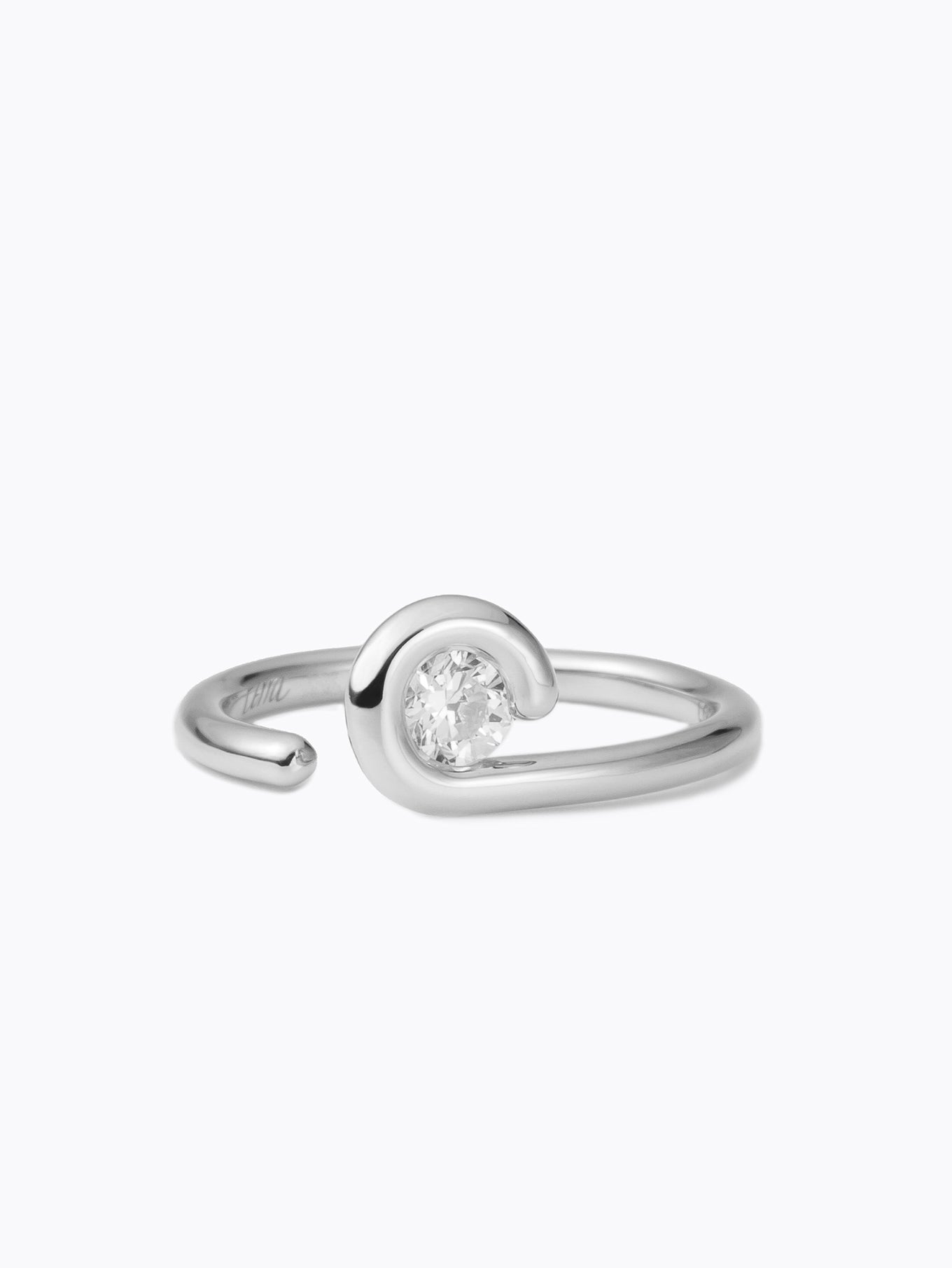 王道のラウンドブリリアントカットのダイヤモンドを1本の線で巻いたデザイン。ダイヤモンドのキューレット部分を大胆に露出し、ミニマルなデザインでありながらエッジィな表情に仕上げています。EGR5は、金属とダイヤモンドが生み出す伝統的なデザイン形式からの脱却と大胆な表現をテーマとした「Engage」コレクションの一作です。