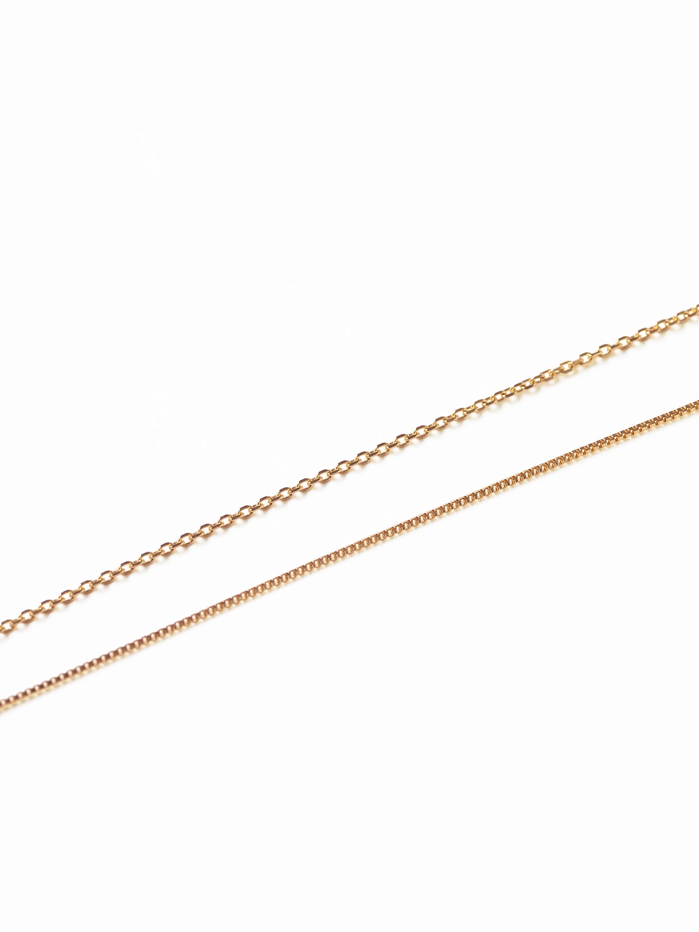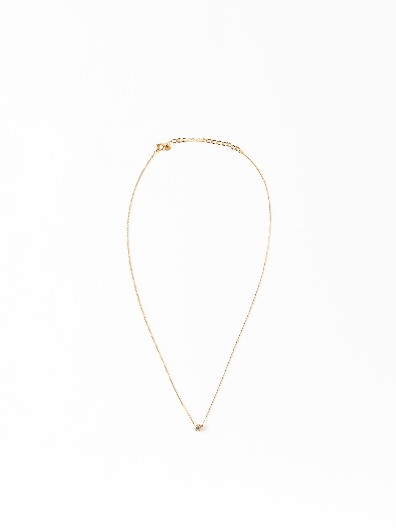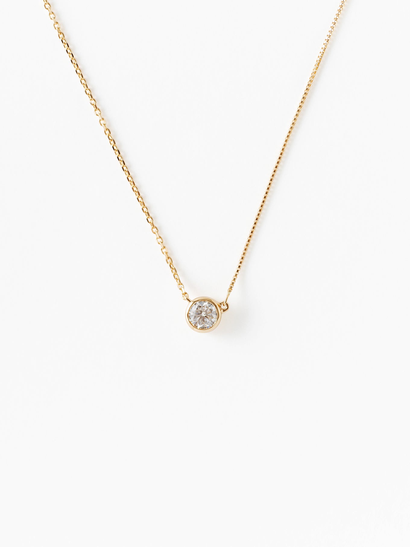 王道のラウンドブリリアントカットのダイヤモンドをミニマルに構成した一粒ダイヤモンドネックレス。左右で異なるチェーンを使用し、ダイヤモンドだけでなくチェーンの美しさにも目を引くデザインです。